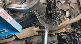 2. Установите опору под продольный рычаг задней подвески и опустите автомобиль, слегка нагрузив подвеску.