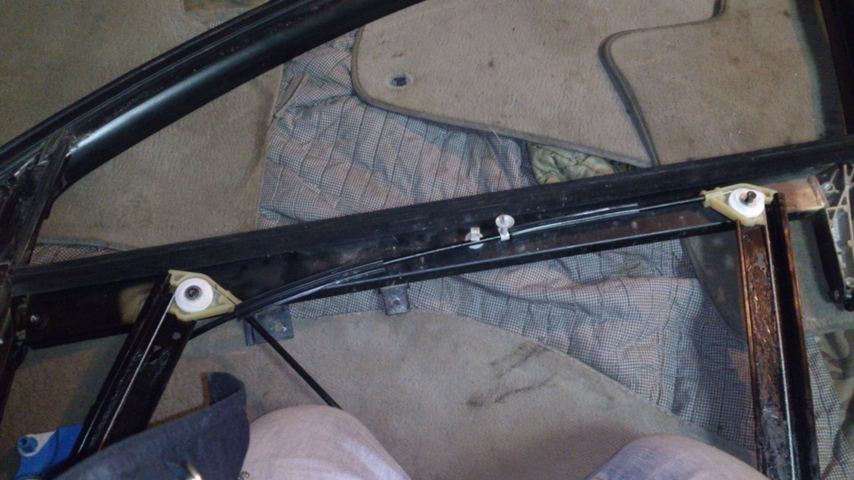 Руками задвигаем стекло в верхнее положение и вставляем обратно в дверь. Кстати для снятия каркаса, так же необходимо демонтировать зеркало. Перед монтажом в дверь, всё обильно смазал литолом.