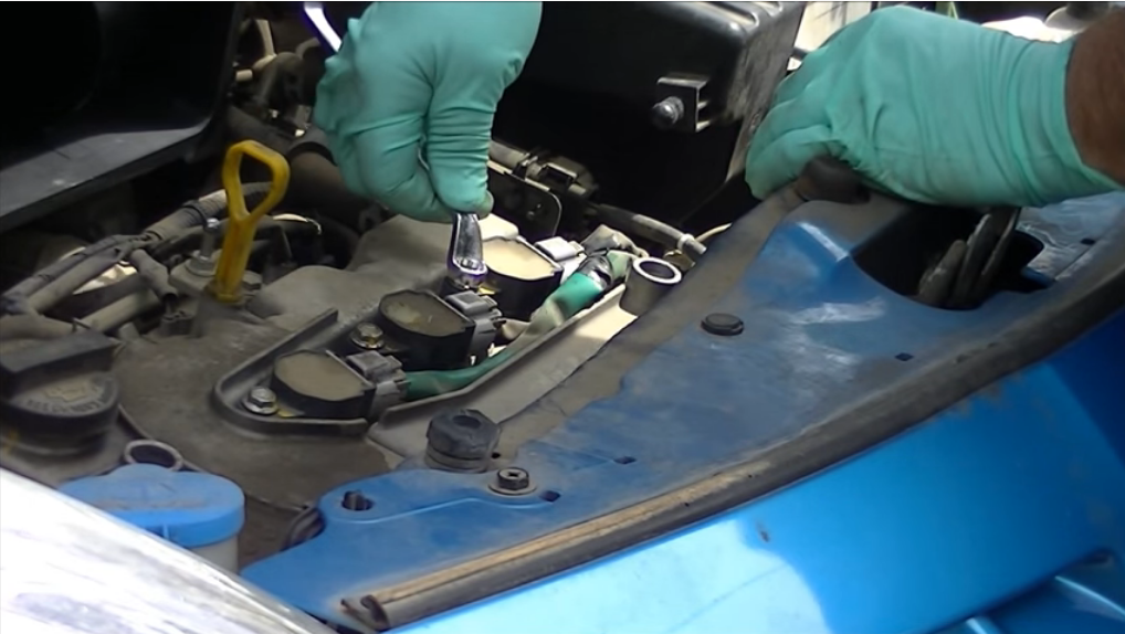 7. Торцевой головкой на 10 мм отворачиваем болт крепления катушки зажигания.