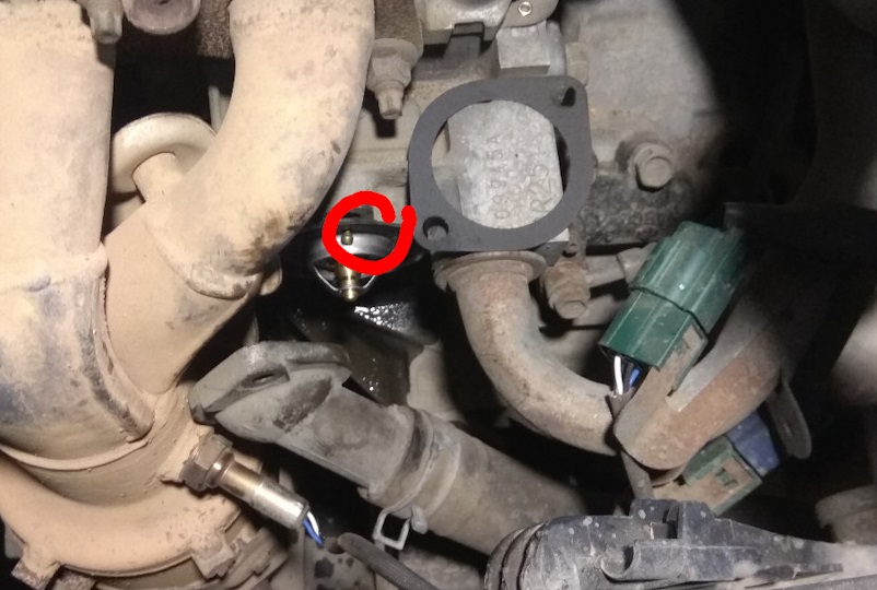 Основной термостат на двигателе MR20DE под патрубком насоса системы охлаждения, соединенным шлангом с нижним патрубком радиатора.