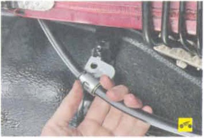 38. Ослабьте хомут крепления шланга вентиляции топливного бака, сжав пассатижами его отогнутые ушки, сдвиньте хомут по шлангу.