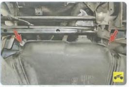 Снятие поперечины задней подвески необходимо потому, что при установленной поперечине наливную трубу невозможно пропустить через зазор между поперечиной и кузовом.