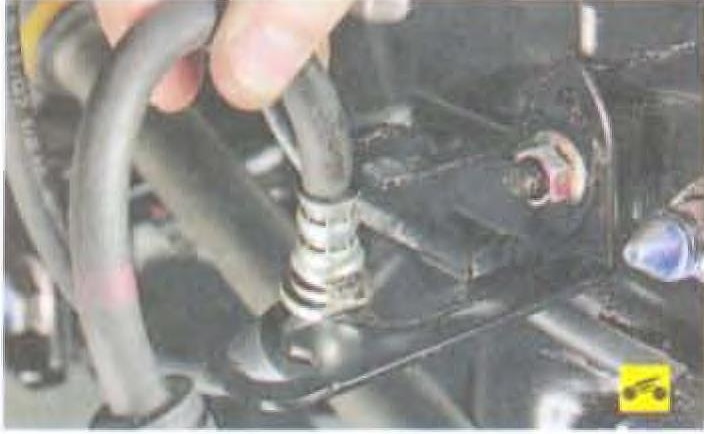 3. Снимите запорную скобу держателя шланга на кронштейне амортизаторной стойки передней подвески.
