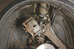 4. Не отсоединяя тормозной шланг, закрепите суппорт проволокой, например, за витки пружины передней подвески. При этом не допускайте скручивания или натяжения шланга.