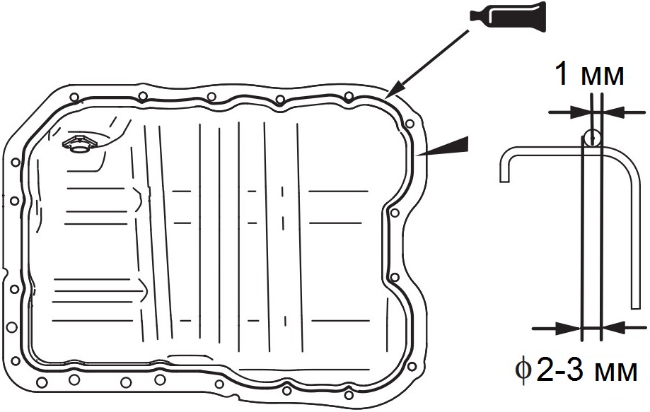14. Нанесите герметик непрерывной полоской диаметром 2-3 мм по всему фланцу масляного поддона.