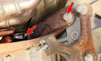 7. Выверните два болта крепления дополнительного термоэкрана к катколлектору в его задней части.